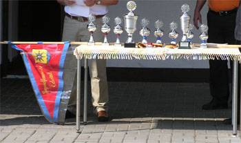 Der Wimpel und die beiden Pokale im Vordergrund sind die Wanderpreise der Gemeinde Edertal,